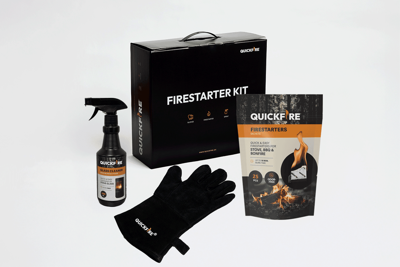 The QUICKFIRE Starter Kit is more than a practical solution – it’s designed to complete the experience of owning a new wood stove. Customize your Starter Kit with QUICKFIRE products. From firestarters and glass cleaners to gloves and lighters, the boxes contain everything needed for a great experience around the wood stove. With a focus on quality and design, our Starter Kits combine functionality and elegance that impress from the very first glance. The only limit is your imagination when it comes to what the box can hold.